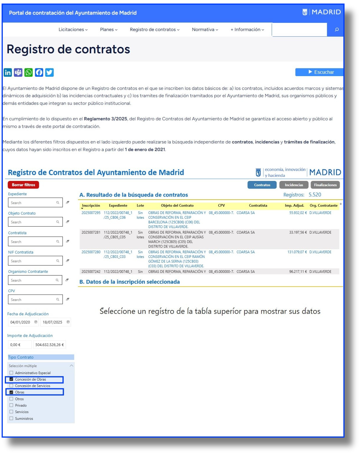 Para conocer la obra pública que está en fase de ejecución, se accede al Portal de Contratación/Registro de contratos del Ayuntamiento de Madrid.