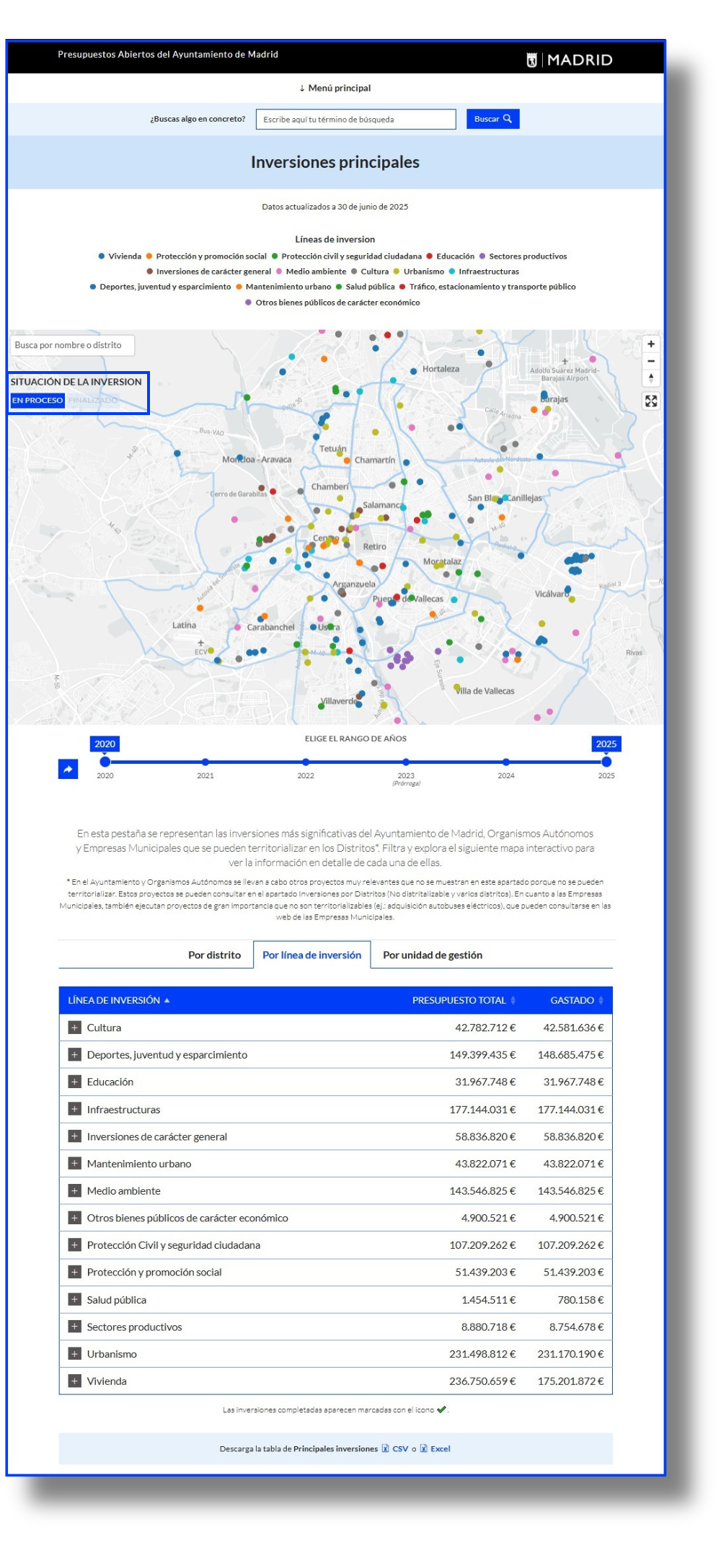 Para obtener más información sobre obra pública en ejecución, se puede acceder a Presupuestos abiertos/Inversiones principales. Allí se encuentran las obras más significativas del Ayuntamiento de Madrid, organismos autónomos y empresas municipales, plasmadas sobre un mapa interactivo que permite acceder a información presupuestaria detallada de cada una de ellas.
